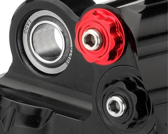M46Rモデルは調節機構はフルアジャスタブル。伸び側と、圧側に低速・高速の独立した調節ノブを有し、細やかなセッティングを可能にします。